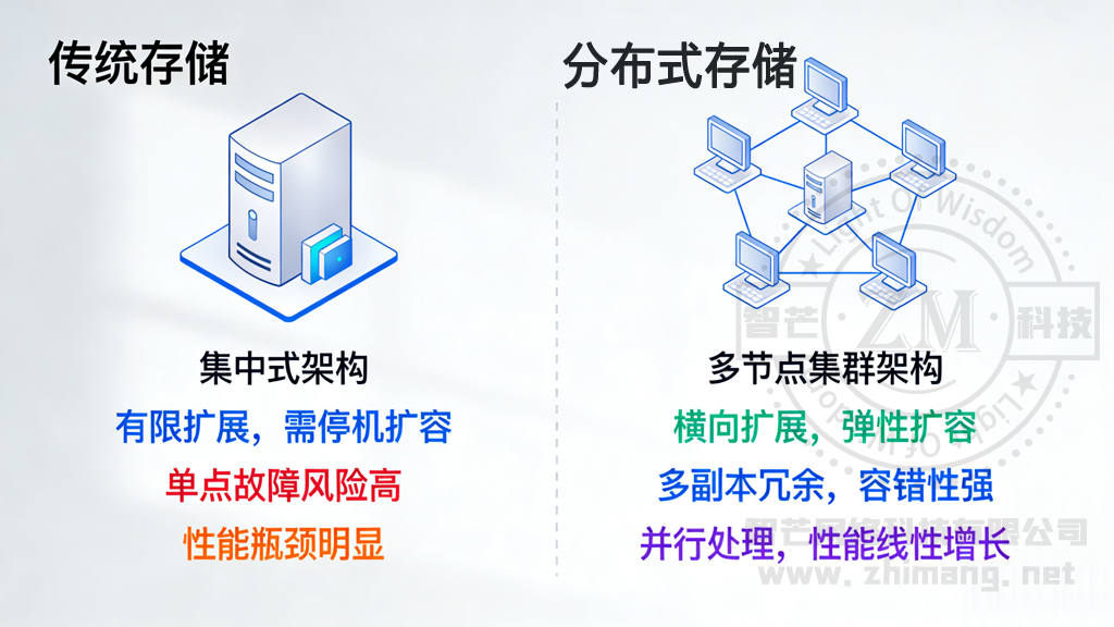 扩展方式 | 横向扩展(Scale-Out),新增节点即可提升容量和性能 | 纵向扩展(Scale-Up),需更换更高配置的硬件,扩展成本高 |