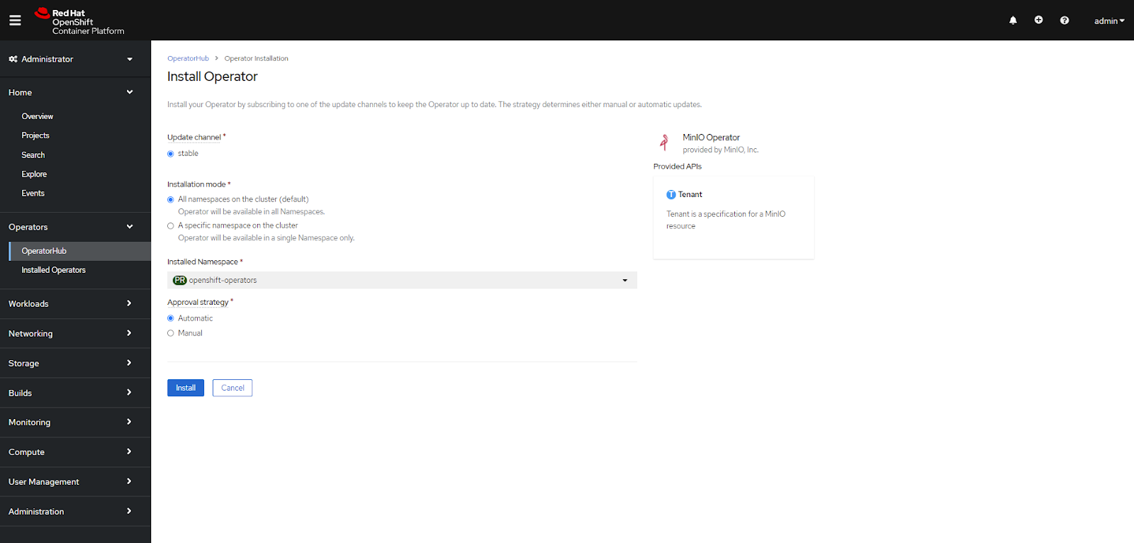 You can deploy the MinIO Kubernetes Operator through the Red Hat® OpenShift® Container Platform 4.7+. You can deploy and manage MinIO Tenants through OpenShift after deploying the MinIO Operator. This procedure includes instructions for the following deployment paths: