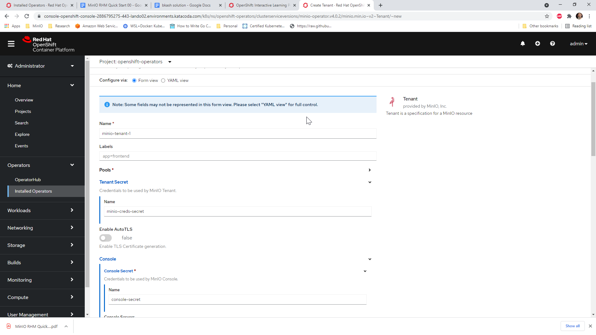 You can deploy and manage MinIO Tenants through OpenShift 4.7+ using the MinIO Kubernetes Operator. This procedure documents deploying a MinIO Tenant using the OpenShift web console.